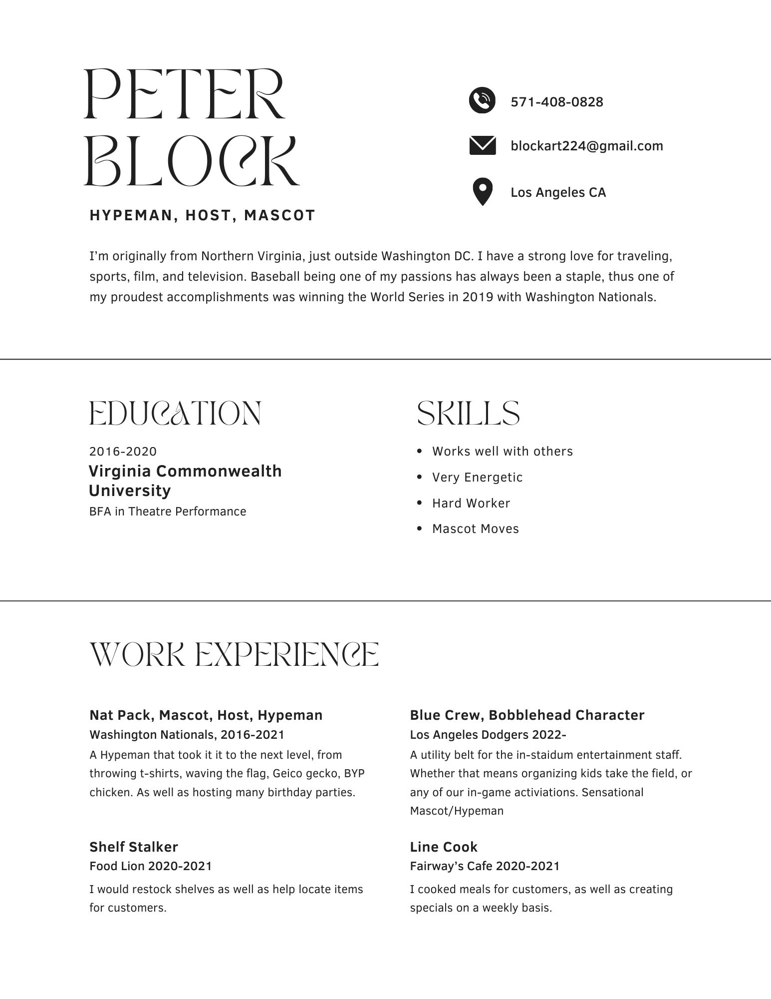 Peter has worked in the MLB for the Washington Nationals and Los Angeles Dodgers.